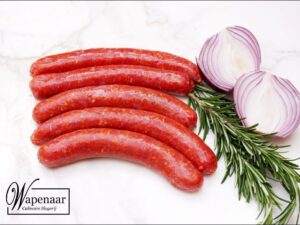 Pittig gekruide scharrel runderworstjes met o.a. harissa, komijn, paprikapoeder, knoflook, koriander, venkelzaad, cayennepeper en kaneel. Uit eigen keuken.