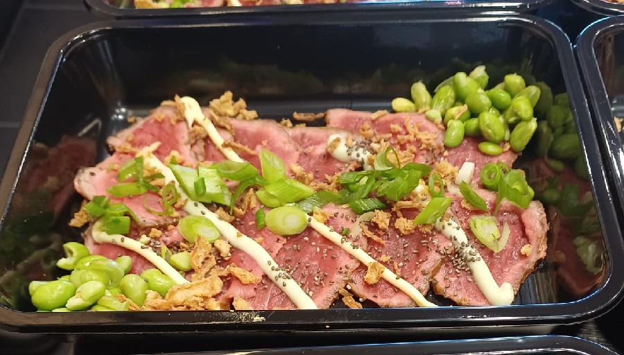 Gegrilde Limousin scharrel biefstuk, edamame boontjes , bos uitjes, kewpie mayo.