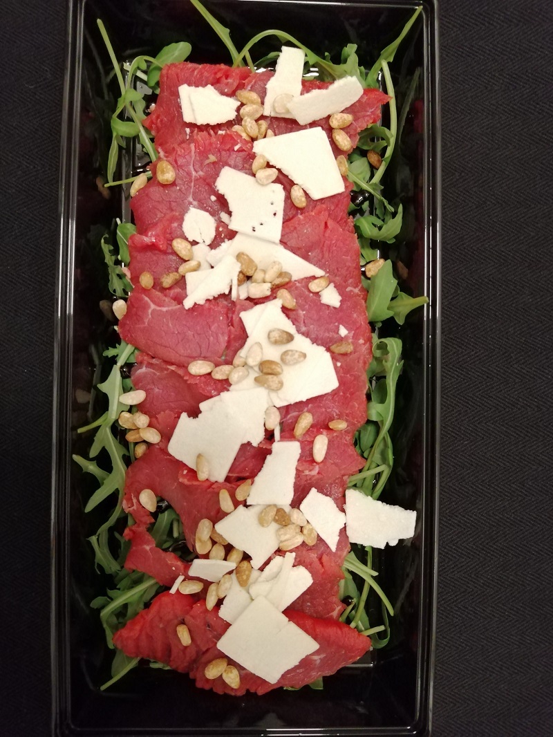 Een opgemaakte carpaccio van dunne plakjes Limousin lende filet, rucola, pijnboompitjes, Parmezaan snippers en Balsamico creme.