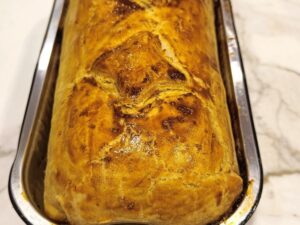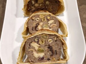 Luxe kalfsgehaktbrood met pistache en in wijn gemarineerde pruimen, appel, abrikozen in bladerdeeg.