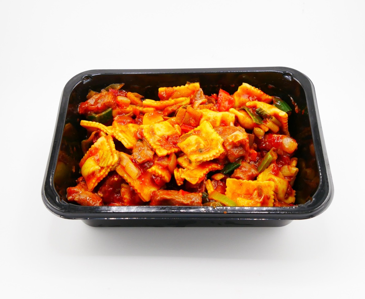 Verse gekookte pasta gevuld met o.a. spinazie. In een jachtsaus met gestoofd mager scharrel Limousin rundvlees en groenten.