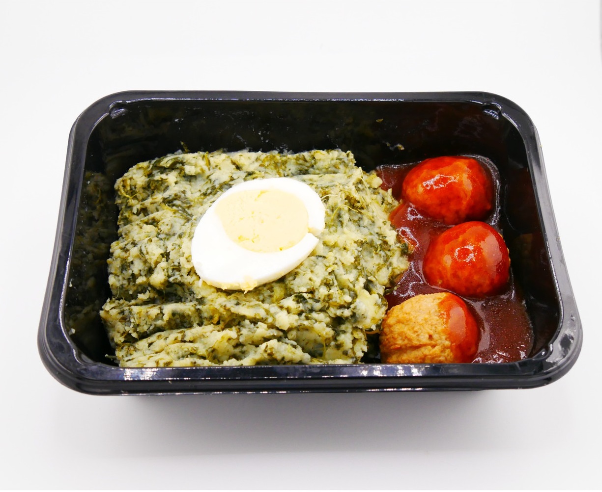 Spinazie, aardappel, stukjes kaas, ei en gehaktballetjes in jussaus.